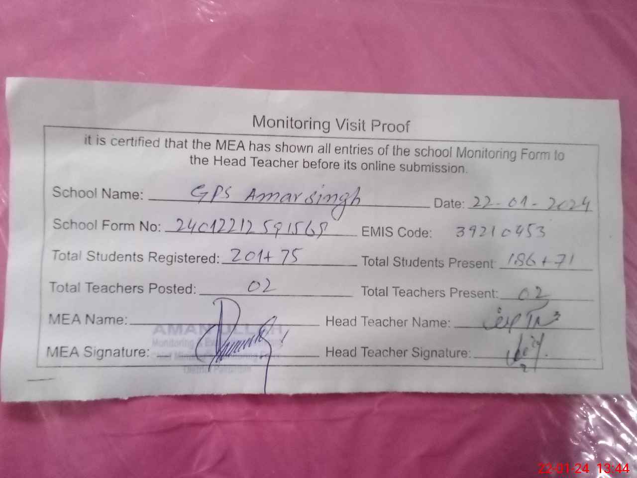 | EMIS Code: 39210453 | Name of School: GPS AMAR SINGH P/O 26/S.P PAKPATTAN | |||