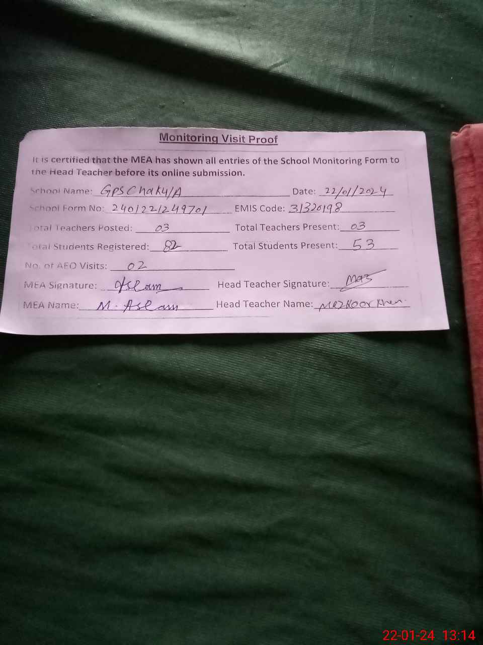 | Attendance Register | Head Teacher | MEA with School | Visit Proof |