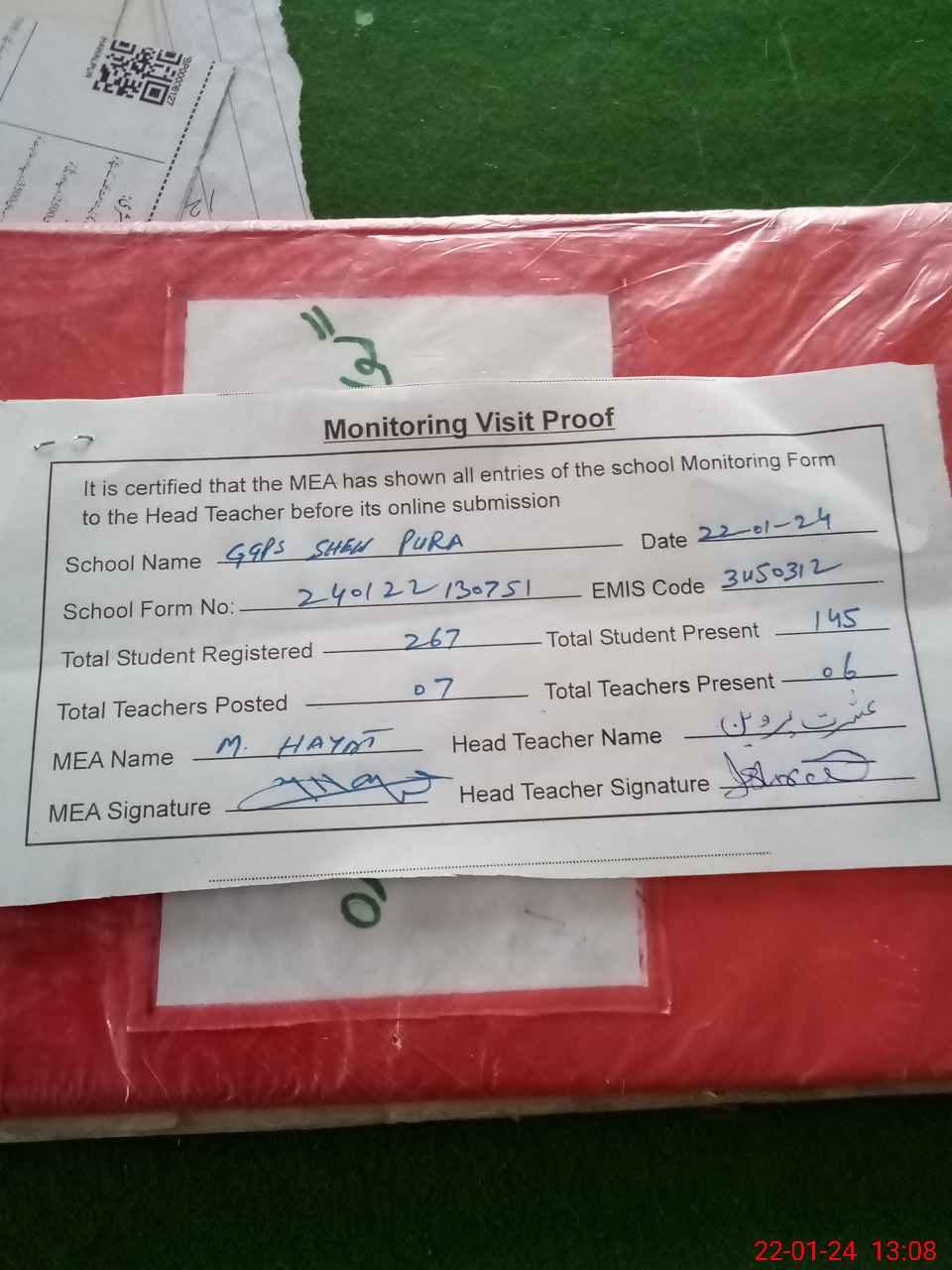 | Attendance Register | Head Teacher | MEA with School | Visit Proof |