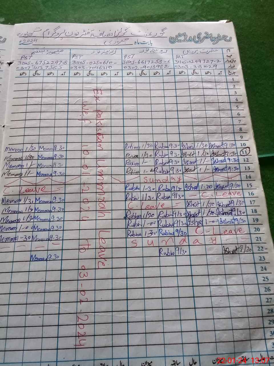 | CNIC | Full Name | Designation | R/C | Absence During Last Calender Month |