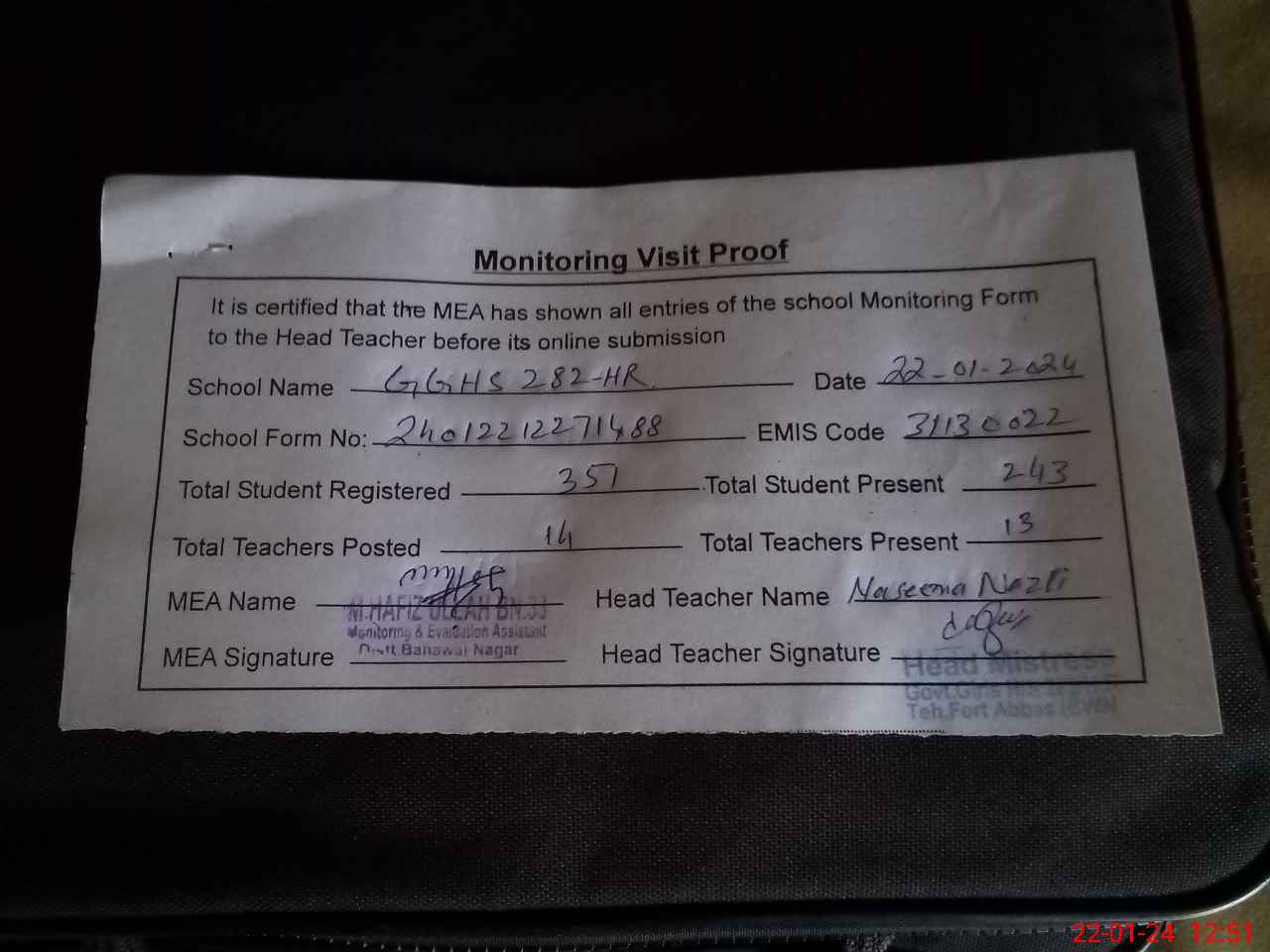 | Attendance Register | Head Teacher | MEA with School | Visit Proof |