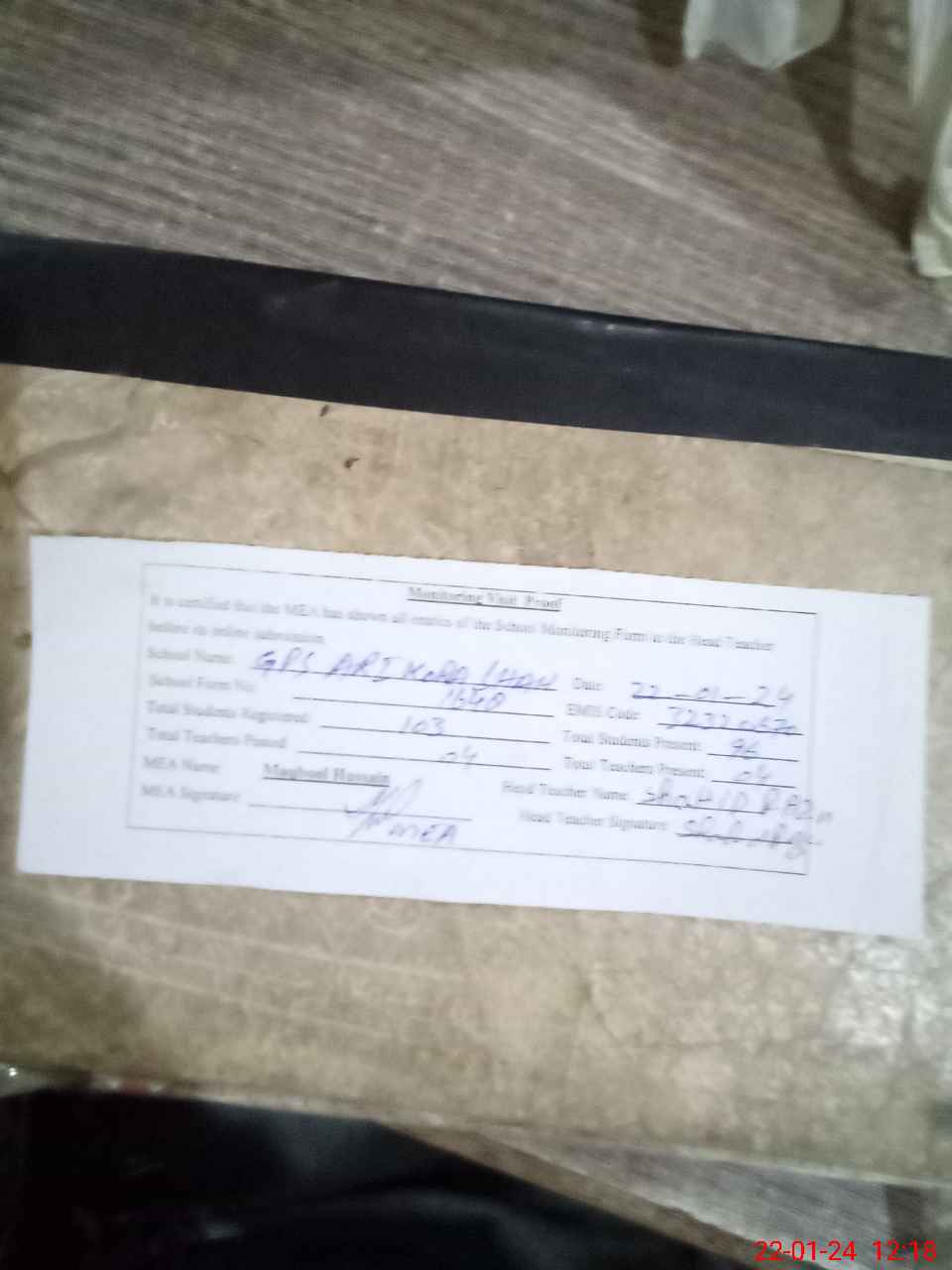 | Attendance Register | Head Teacher | MEA with School | Visit Proof |