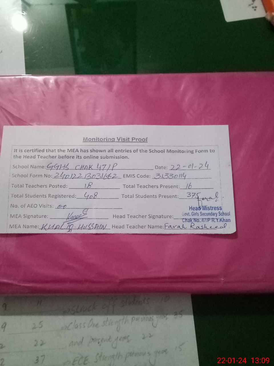 | Attendance Register | Head Teacher | MEA with School | Visit Proof |