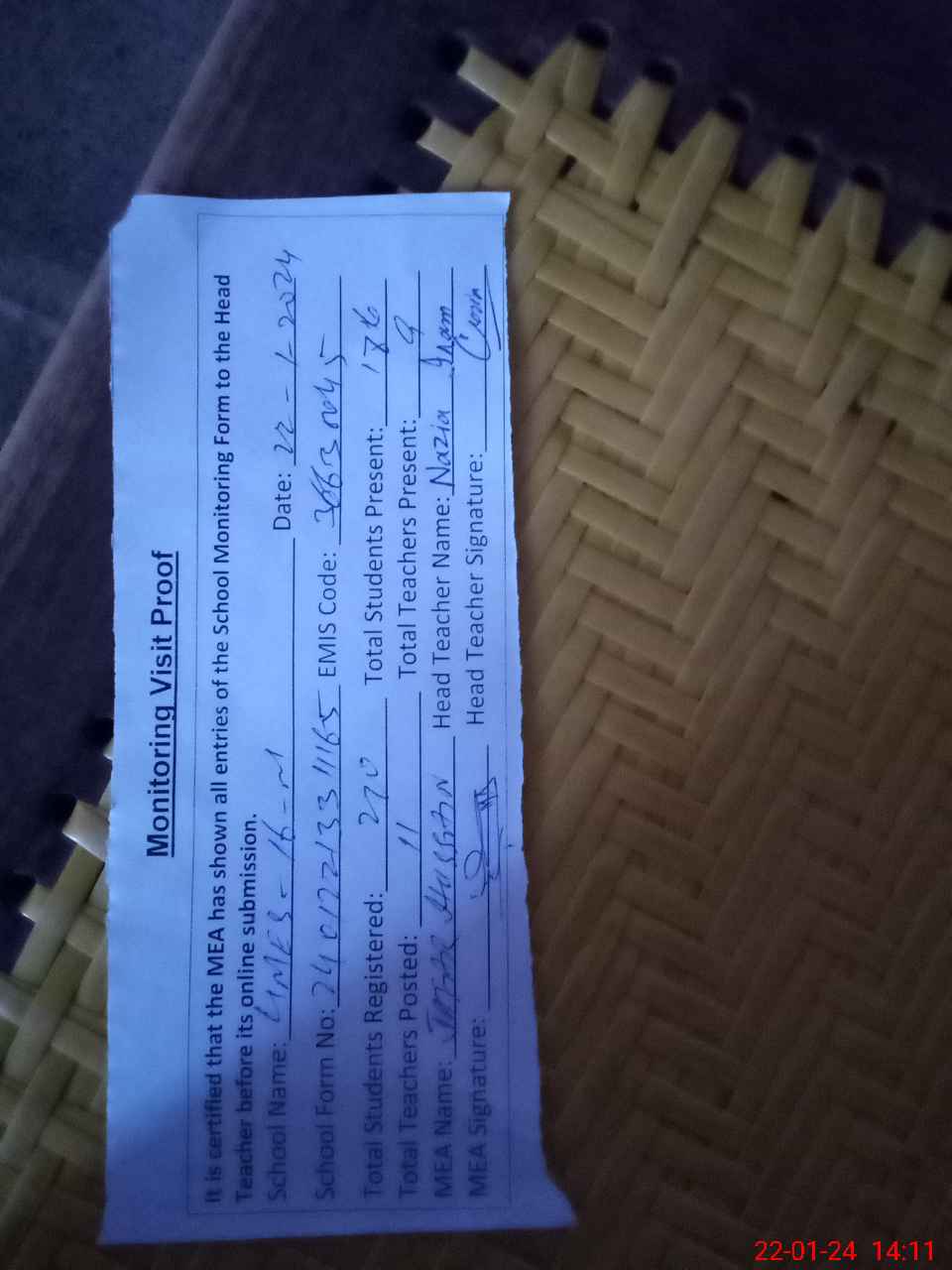 | Certified that this School was Inspected by the Undersigned MEA/DMO Today and the Information Stated Above is as Per Record. | |||||