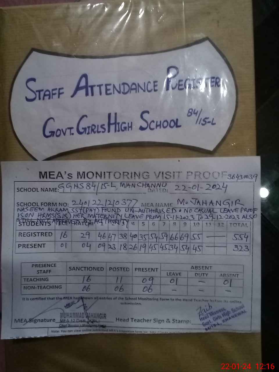 | Remarks (Use Separate Page if Required): NASEEM AKRAM SST PHY FOUND UN AUTHORISED NO CASUAL LEAVE PROOF IS AVAILABLE ON HRMS SIS HER MATERNITY LEAVE FROM 15 NOVEMBER 2023 TO 29 DECEMBER 2023 ALSO STILL NOT APPROVED BY AUTHORITY NSB GRANTS RECORDS IS NOT AVAILABLE FTF RECORDS IS NOT MAINTAINED ITS MADE WITH LED PENCIL THREE TOILETS FOUND LOCKED AND NON FUNCTIONAL ALL HAND WASHING POINTS ARE WITHOUT SOAP CLASS TWO AND TEN FORMS D4 ARE NOT AVAILABLE BOGUS STUDENTS ENROLLMENT IN EIGHT CLASS RANDOM CLASS TWO IS NOW IN CLASS FOUR | |||||