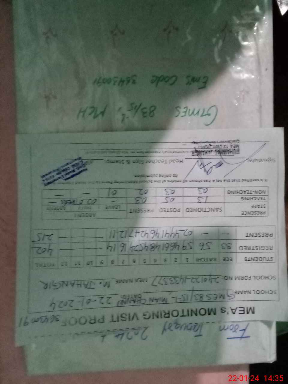 | Certified that this School was Inspected by the Undersigned MEA/DMO Today and the Information Stated Above is as Per Record. | |||||