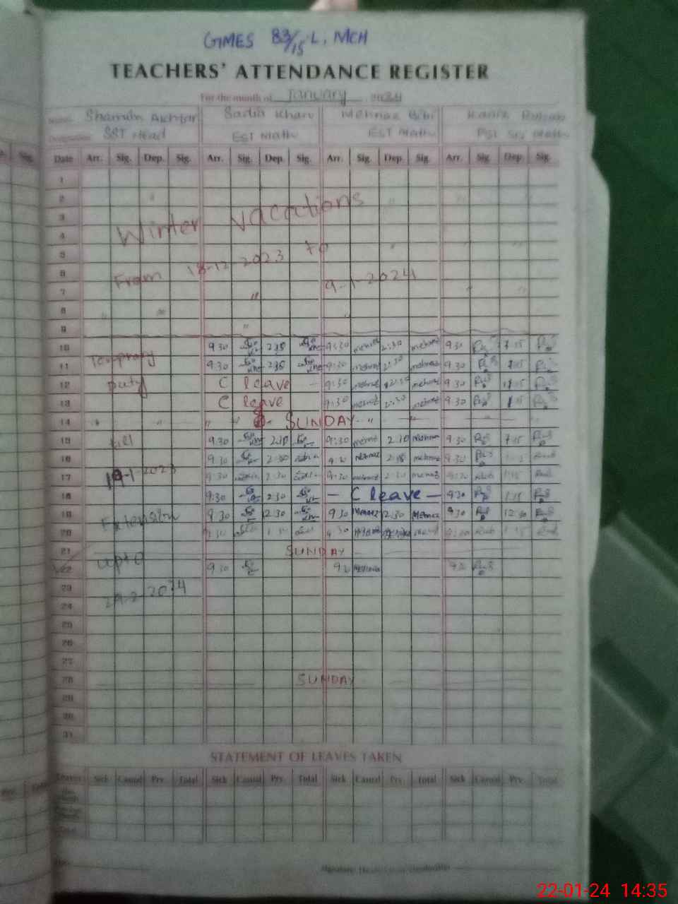 | Leave | Duty | Absent | Maternity | Medical | Ex- Pak |