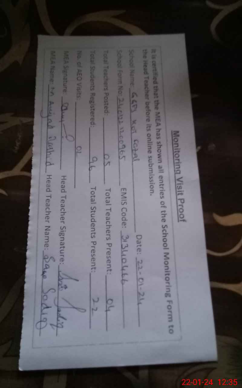 | Attendance Register | Head Teacher | MEA with School | Visit Proof |