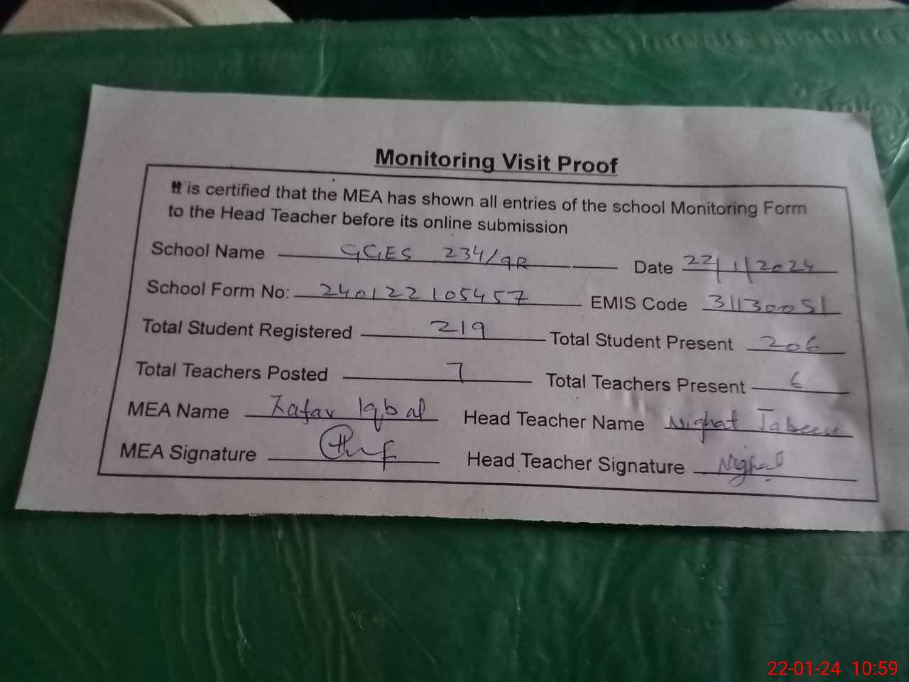 | Monitoring Date: 22-01-2024 | Start Time: 22-01-2024 10:46 AM | End Time: 22-01-2024 10:59 AM | Name of MEA: Za**** Iq**** BN**** | |