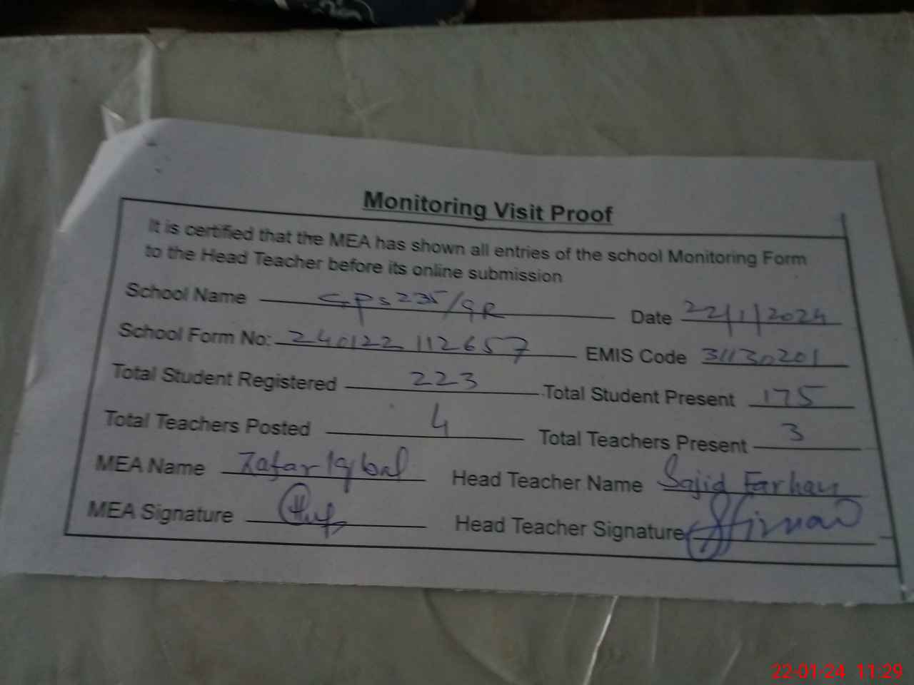 | Attendance Register | Head Teacher | MEA with School | Visit Proof |
