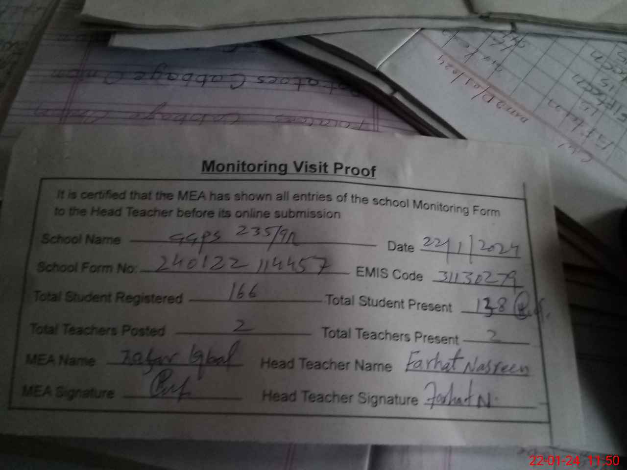 | Attendance Register | Head Teacher | MEA with School | Visit Proof |