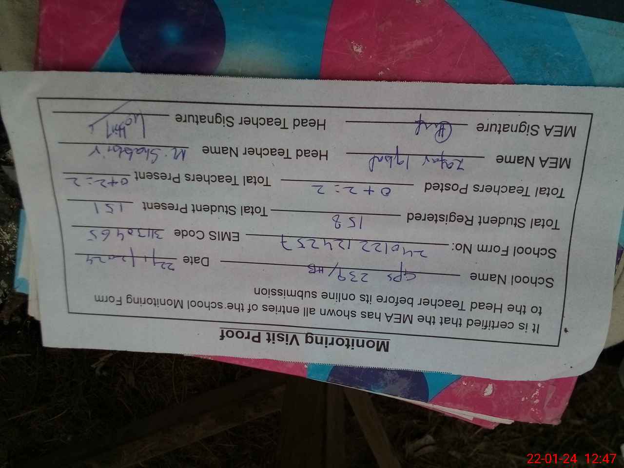 | Attendance Register | Head Teacher | MEA with School | Visit Proof |