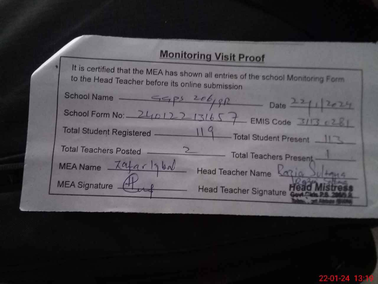 | Attendance Register | Head Teacher | MEA with School | Visit Proof |