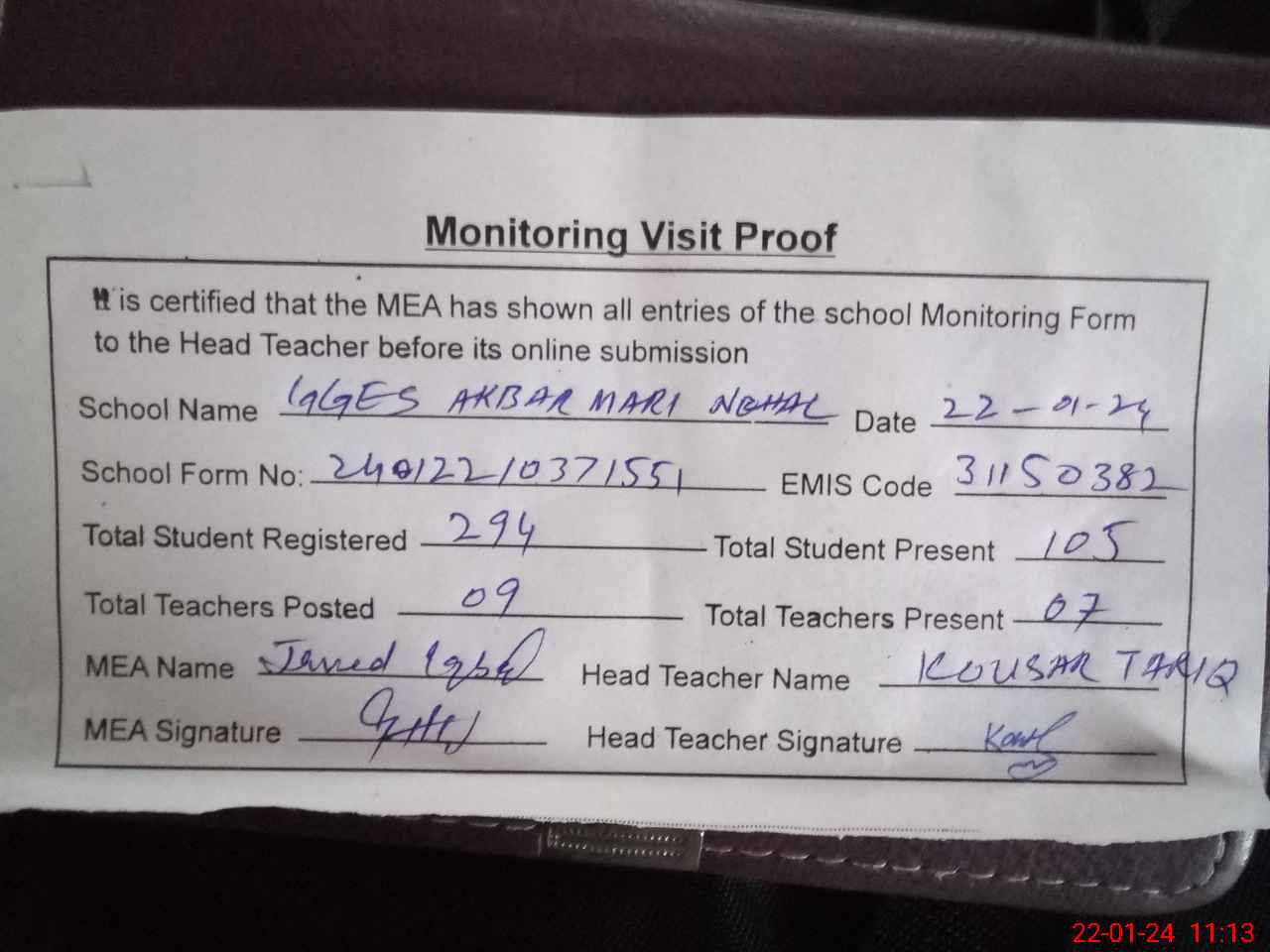 | Attendance Register | Head Teacher | MEA with School | Visit Proof |
