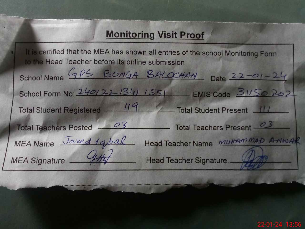 | Attendance Register | Head Teacher | MEA with School | Visit Proof |