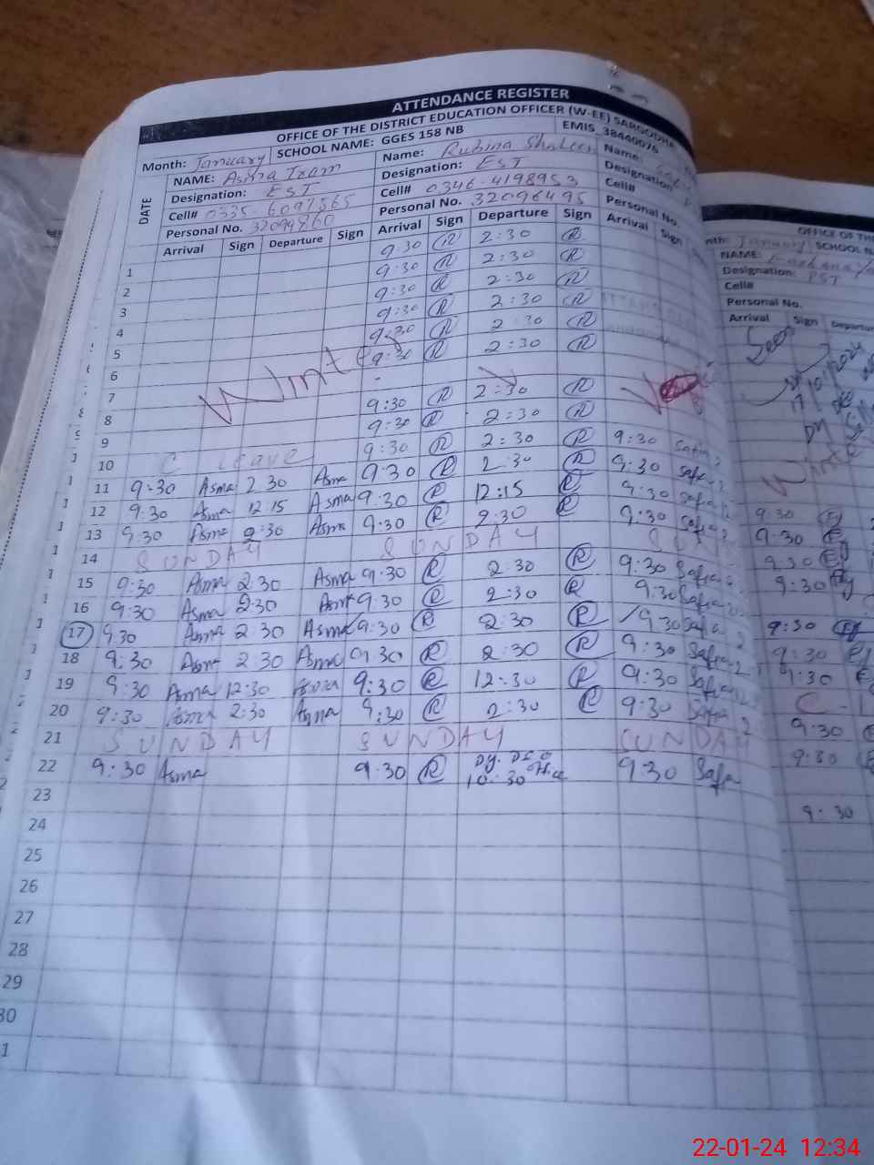 | Name: As**** Ir**** Designation: (School Headmaster's/Headmistress's) EST SCI Phone/Cell Number: 03**** |