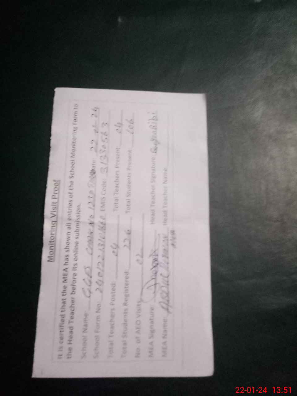 | Attendance Register | Head Teacher | MEA with School | Visit Proof |
