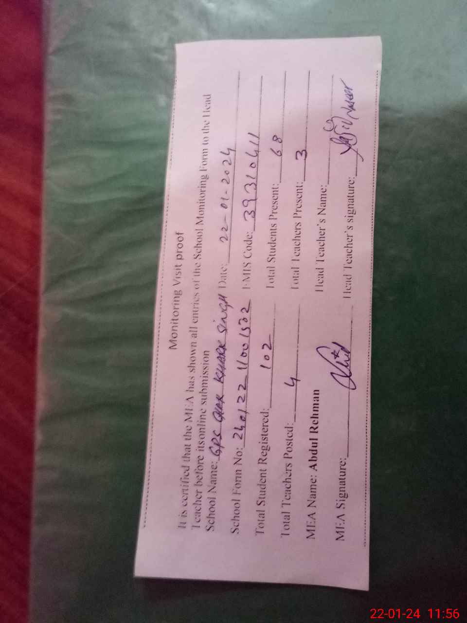 | Attendance Register | Head Teacher | MEA with School | Visit Proof |