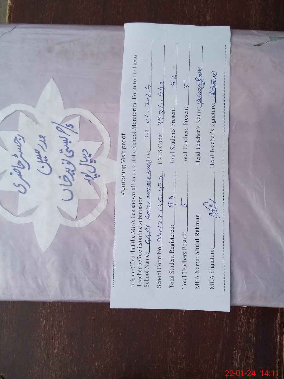 | Attendance Register | Head Teacher | MEA with School | Visit Proof |