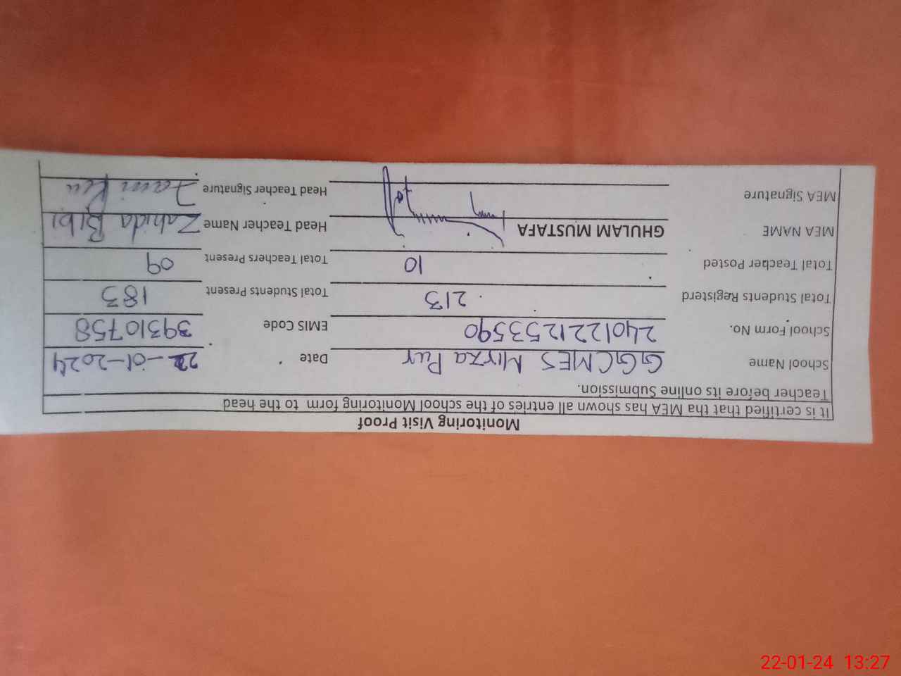 | Attendance Register | Head Teacher | MEA with School | Visit Proof |