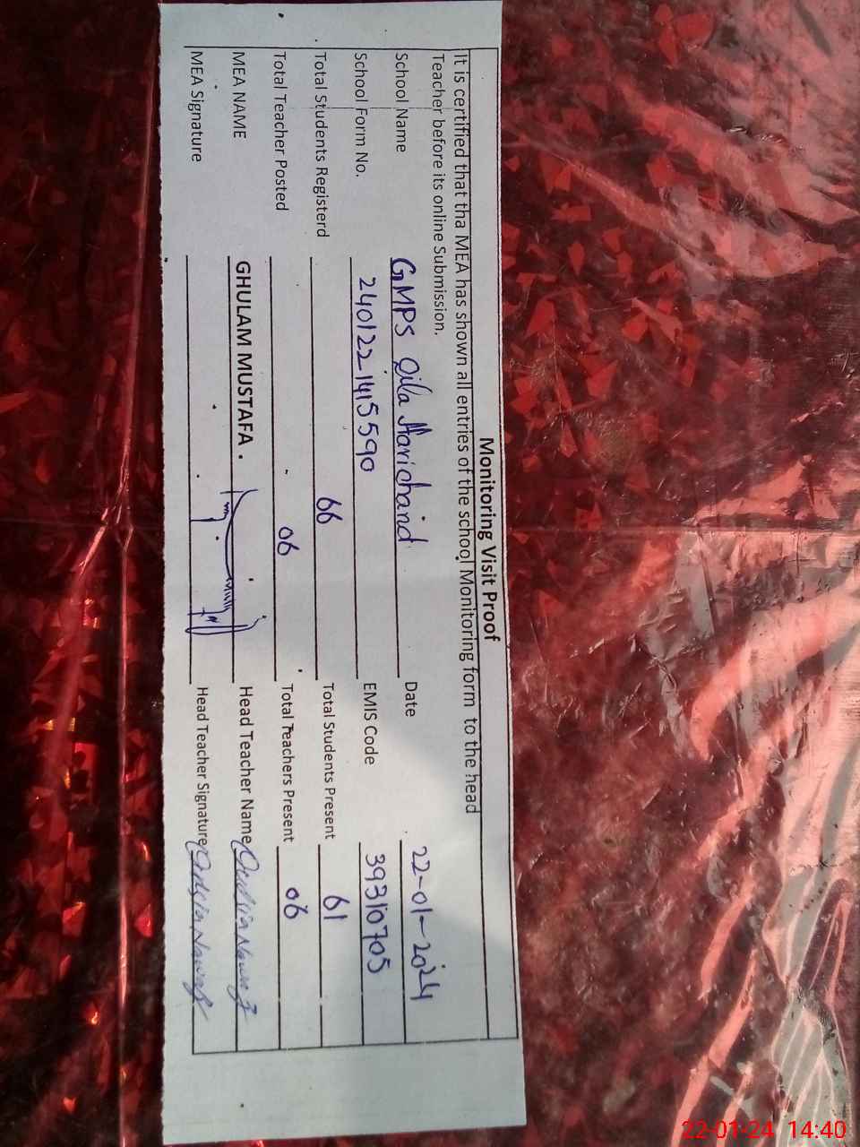 | Attendance Register | Head Teacher | MEA with School | Visit Proof |
