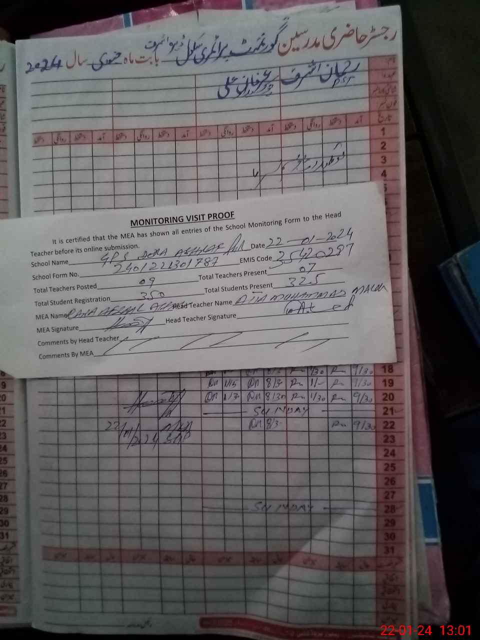 | Attendance Register | Head Teacher | MEA with School | Visit Proof |