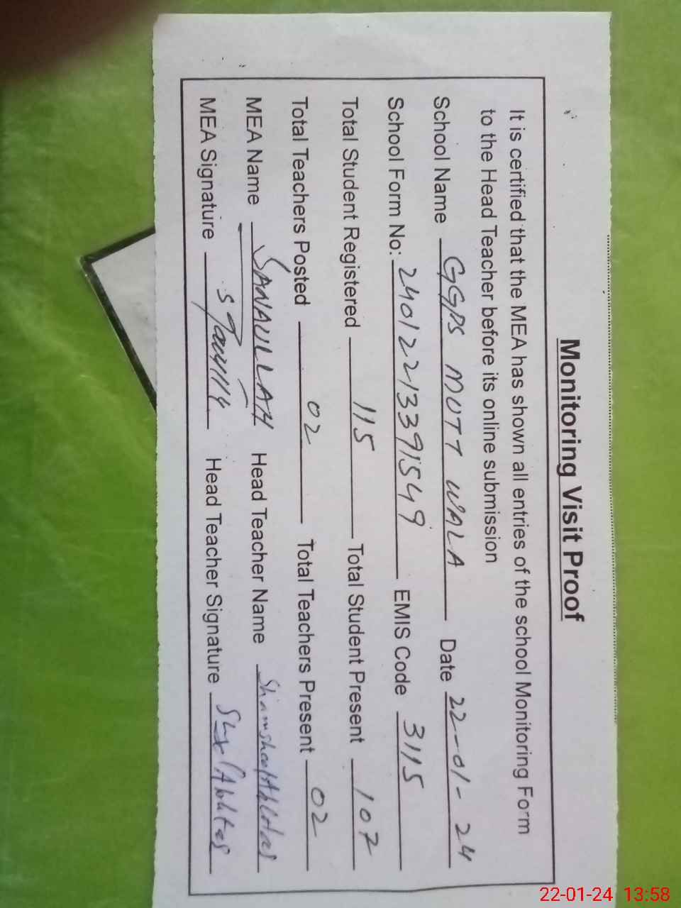 | Attendance Register | Head Teacher | MEA with School | Visit Proof |