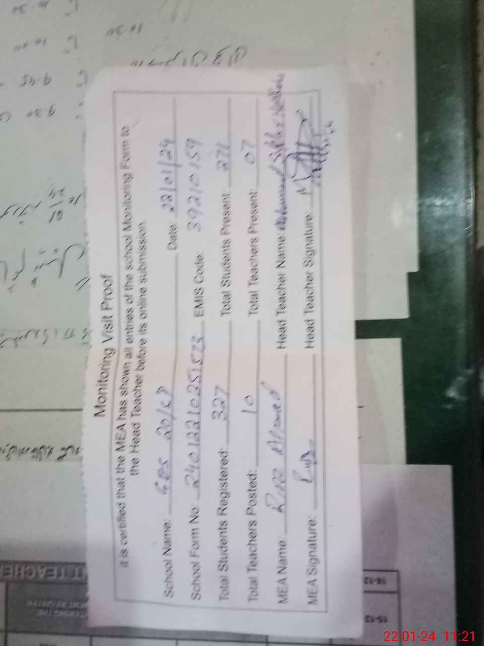 | Attendance Register | Head Teacher | MEA with School | Visit Proof |
