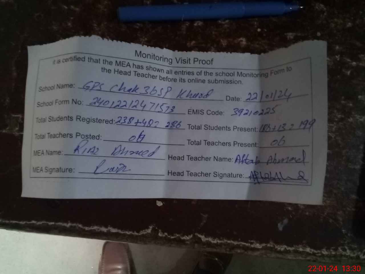 | Attendance Register | Head Teacher | MEA with School | Visit Proof |