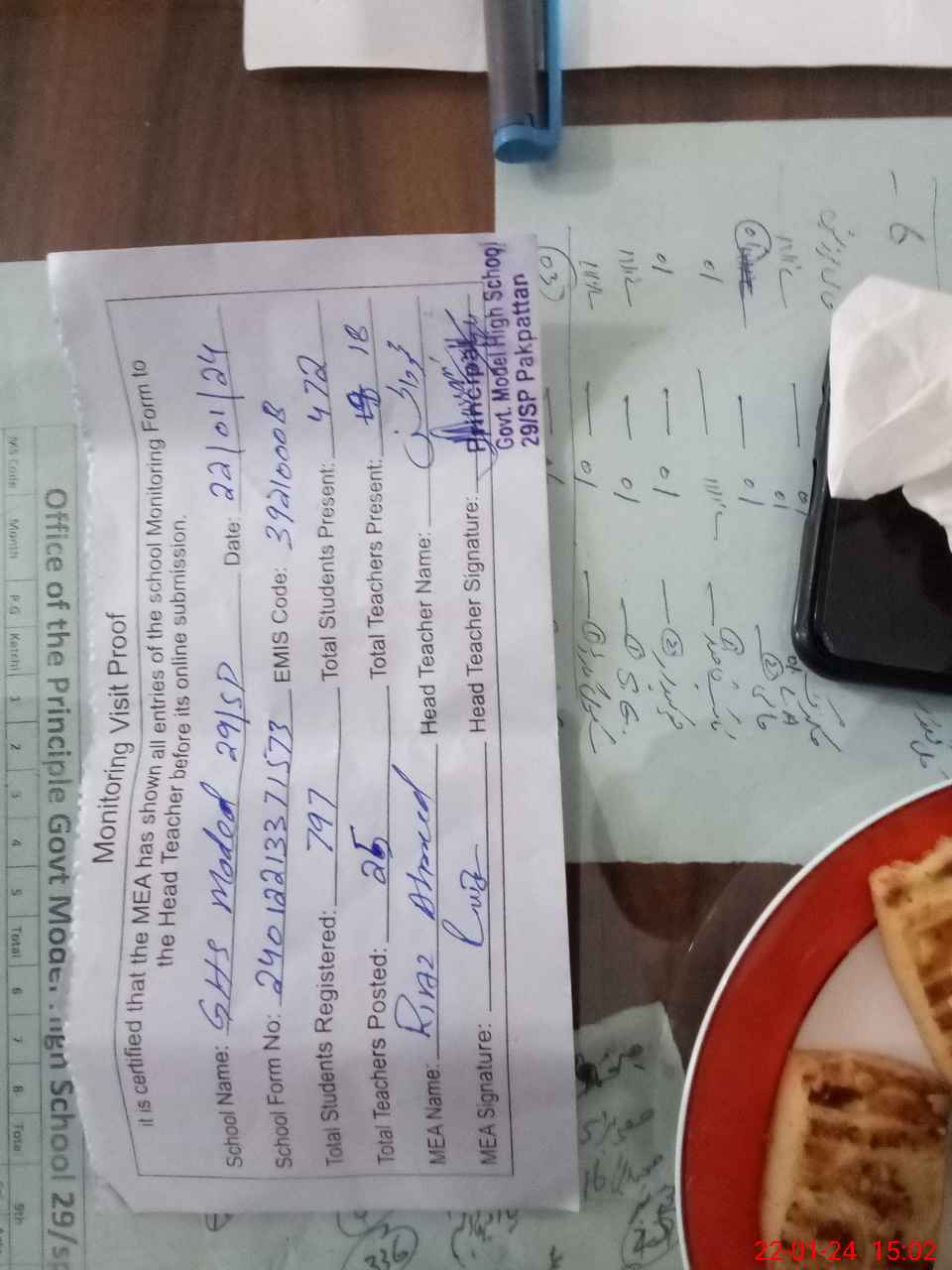 | Attendance Register | Head Teacher | MEA with School | Visit Proof |