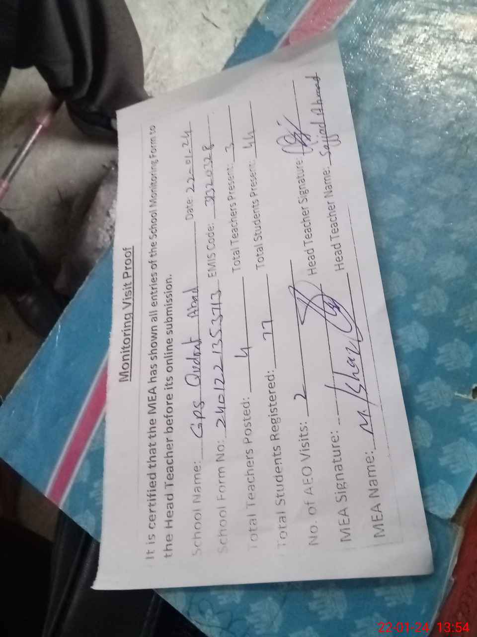 | Attendance Register | Head Teacher | MEA with School | Visit Proof |