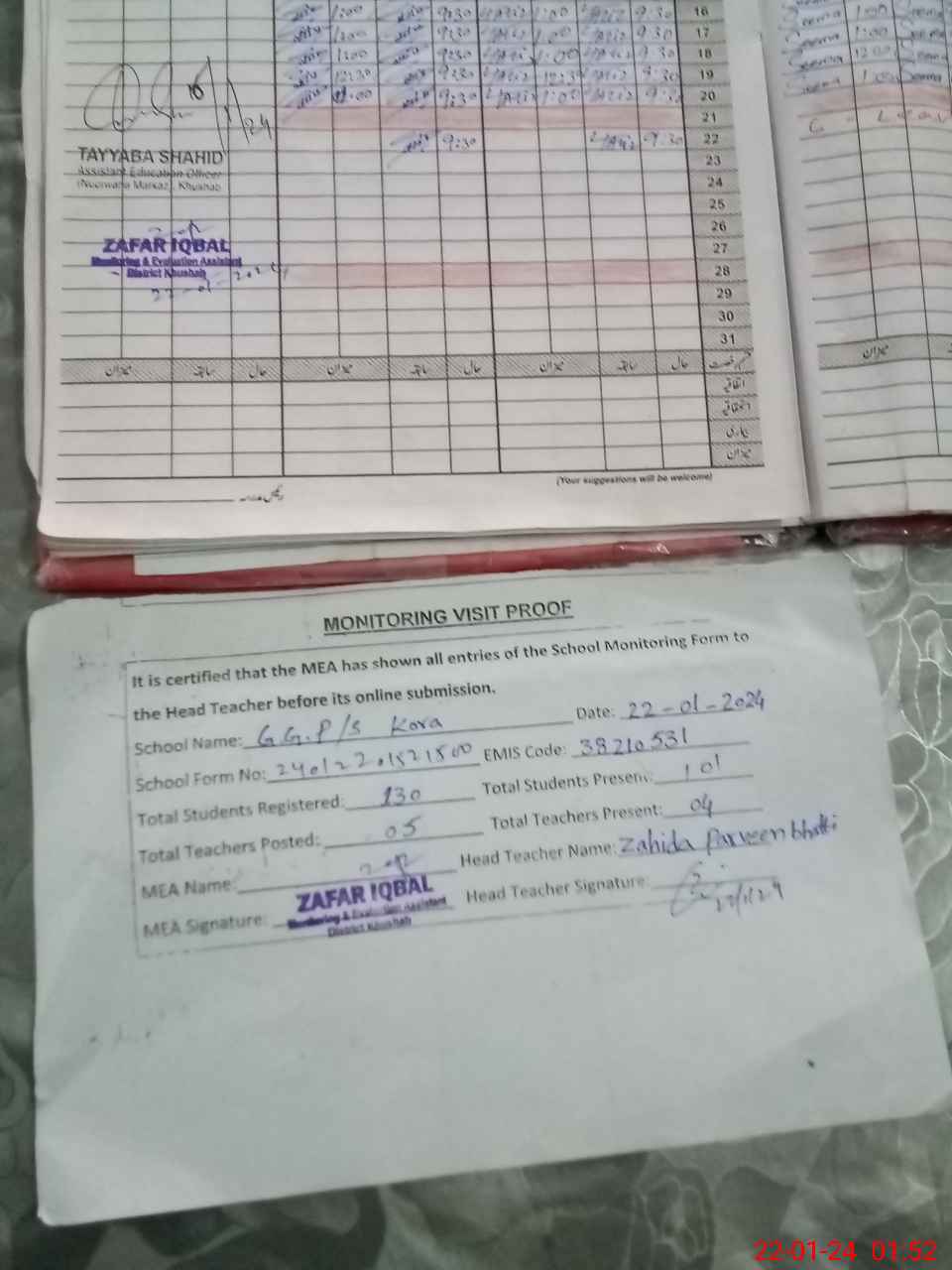| Attendance Register | Head Teacher | MEA with School | Visit Proof |