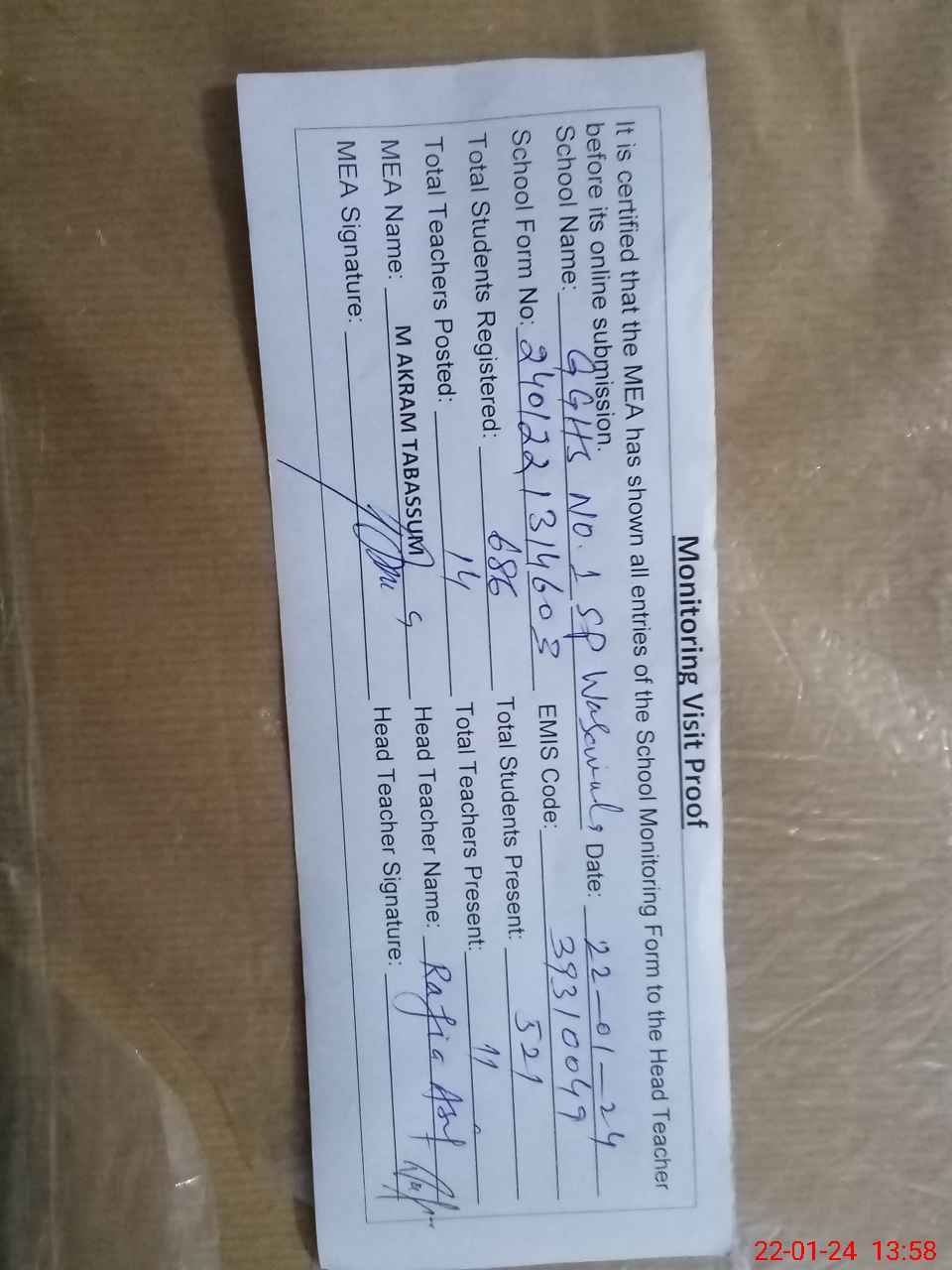 | Attendance Register | Head Teacher | MEA with School | Visit Proof |