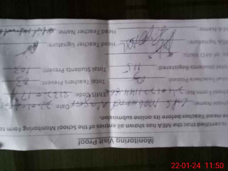 | Name: KH**** ME**** Designation: (School Headmaster's/Headmistress's) PST Phone/Cell Number: 03**** |