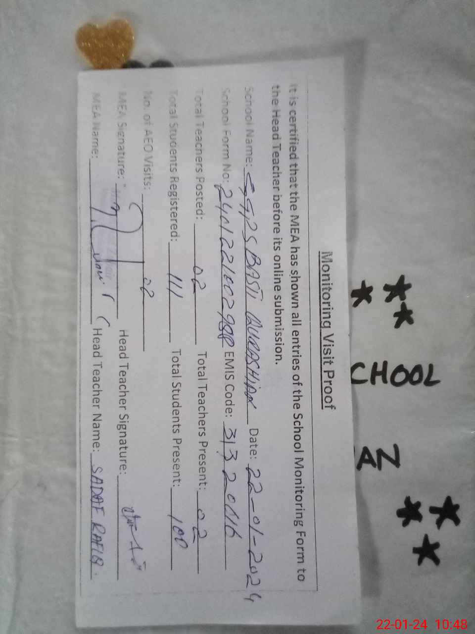 | Name: SA**** RA**** Designation: (School Headmaster's/Headmistress's) PST Phone/Cell Number: 03**** |