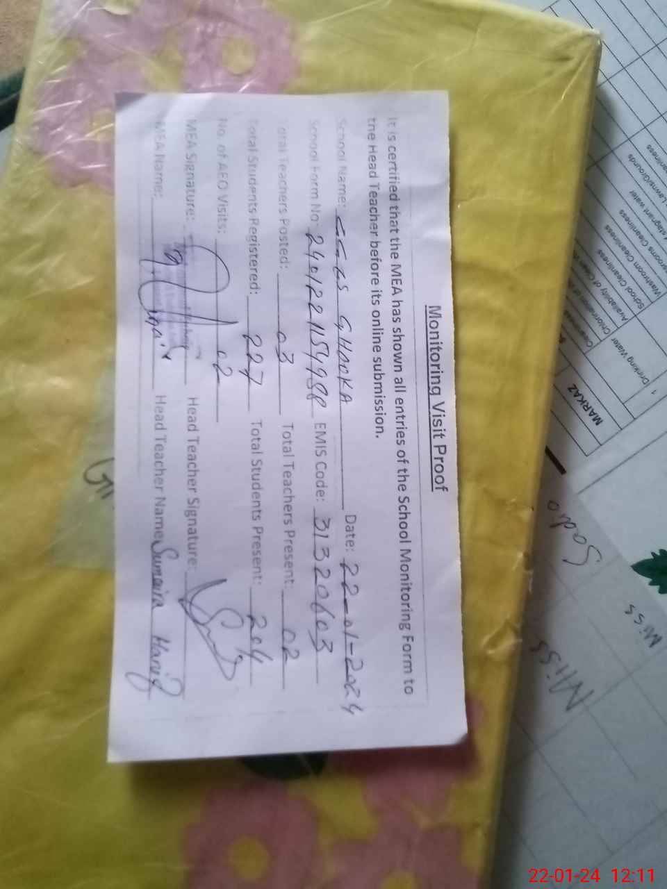 | Attendance Register | Head Teacher | MEA with School | Visit Proof |
