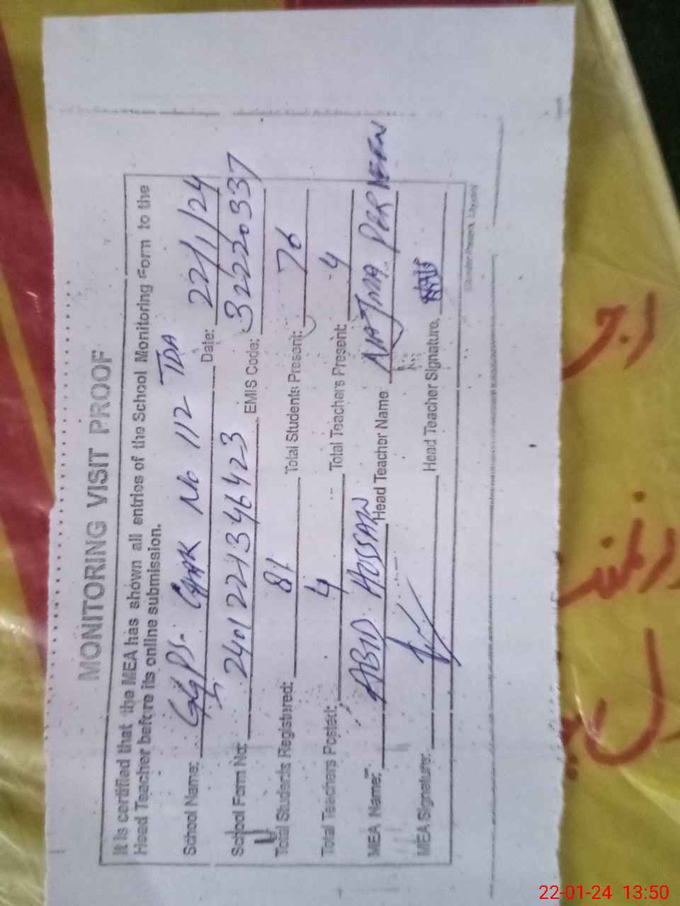 | Attendance Register | Head Teacher | MEA with School | Visit Proof |