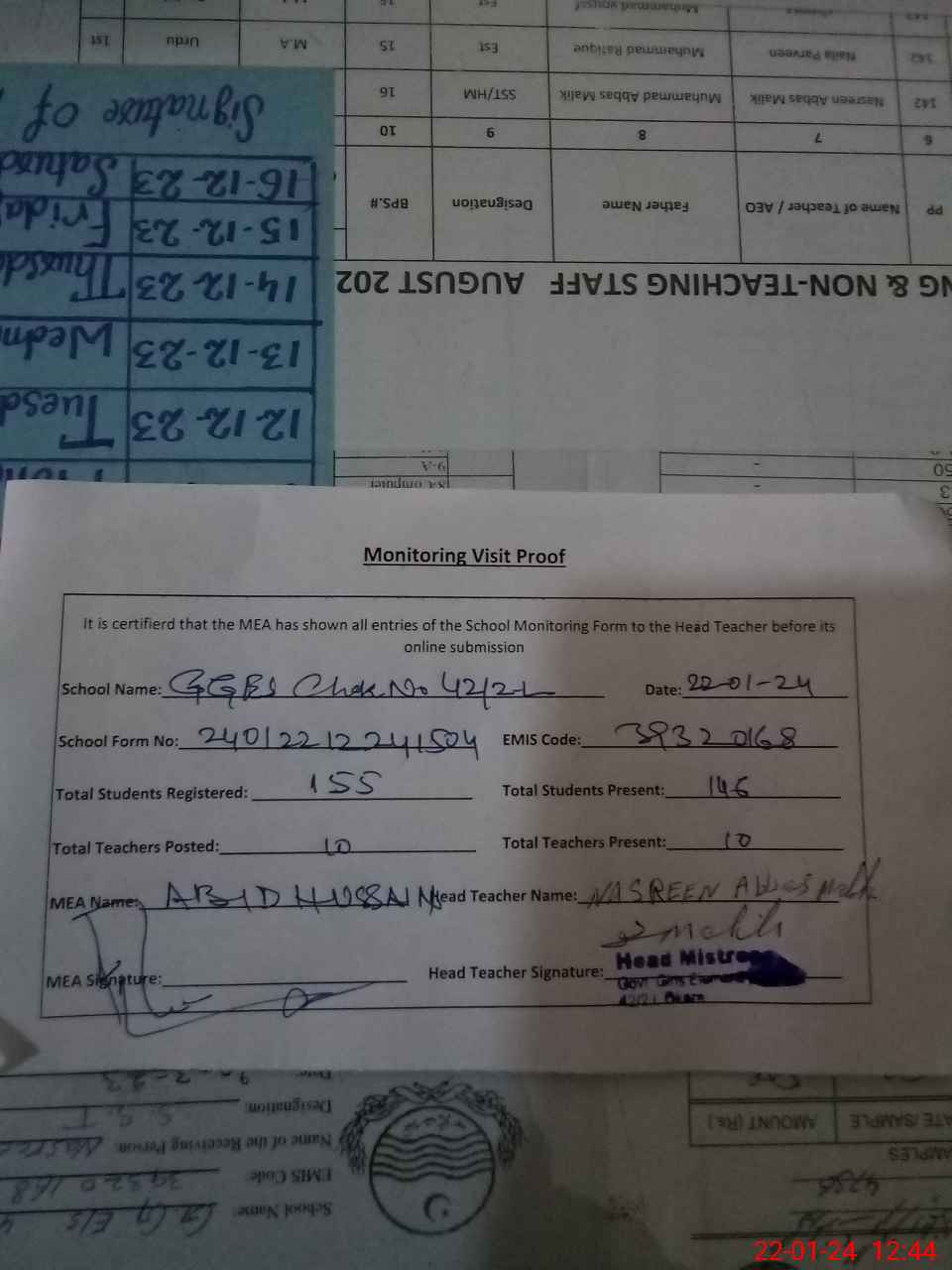 | Attendance Register | Head Teacher | MEA with School | Visit Proof |