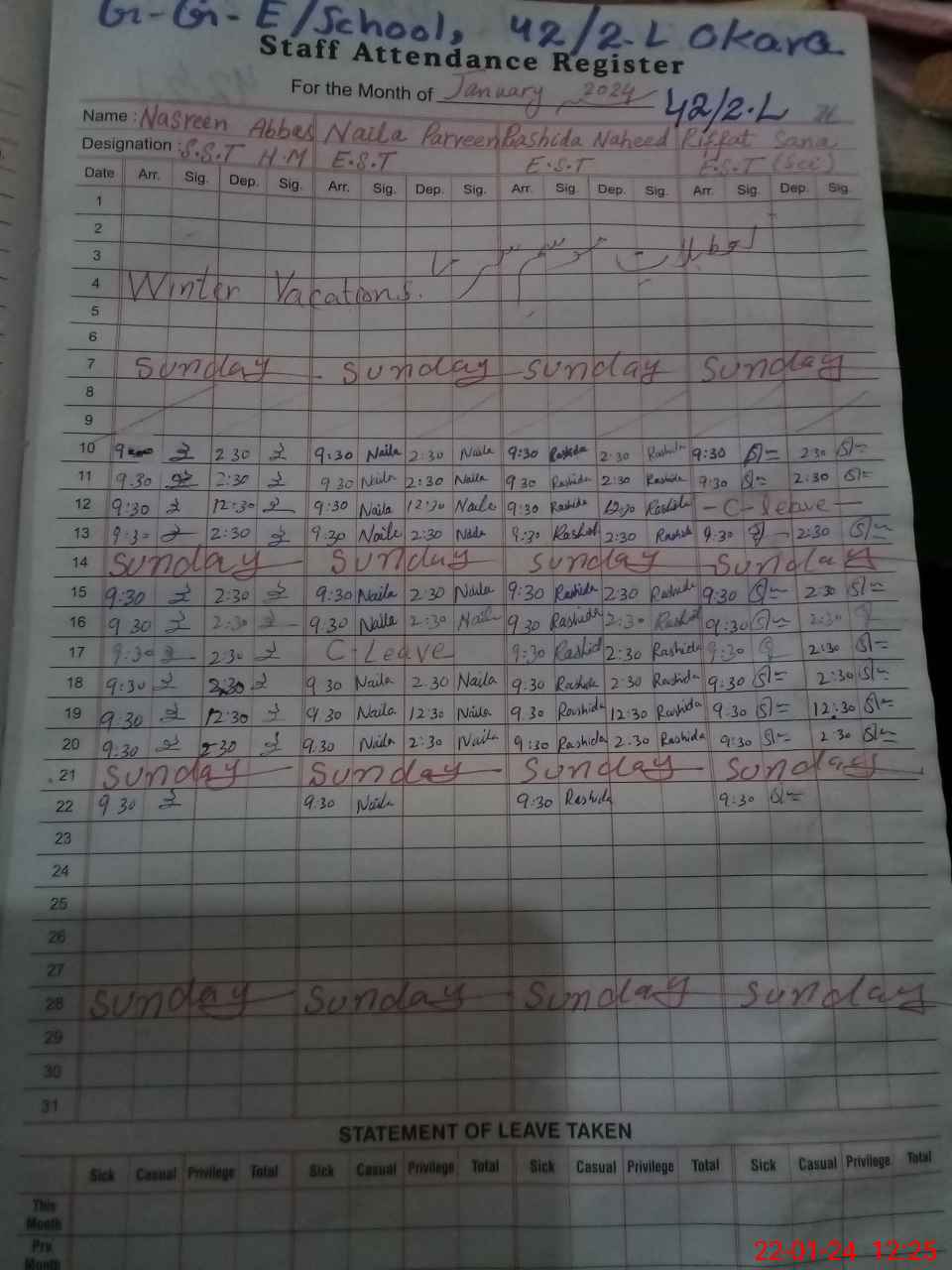 | CNIC | Full Name | Designation | R/C | Absence During Last Calender Month |