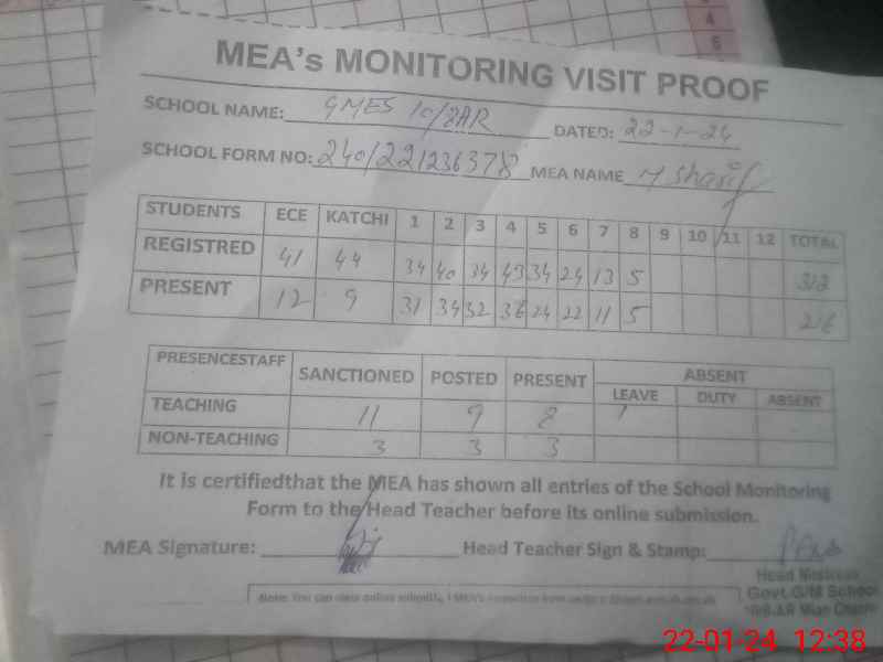 | Attendance Register | Head Teacher | MEA with School | Visit Proof |