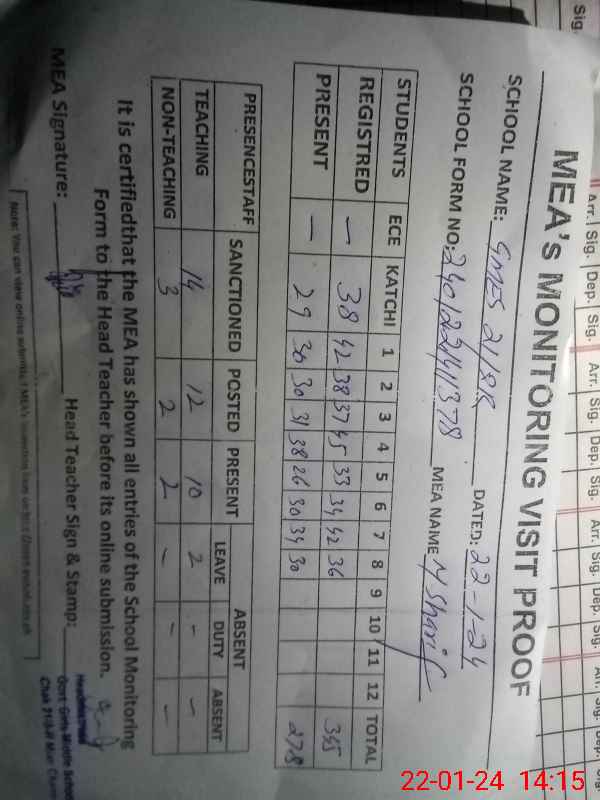 | Certified that this School was Inspected by the Undersigned MEA/DMO Today and the Information Stated Above is as Per Record. | |||||