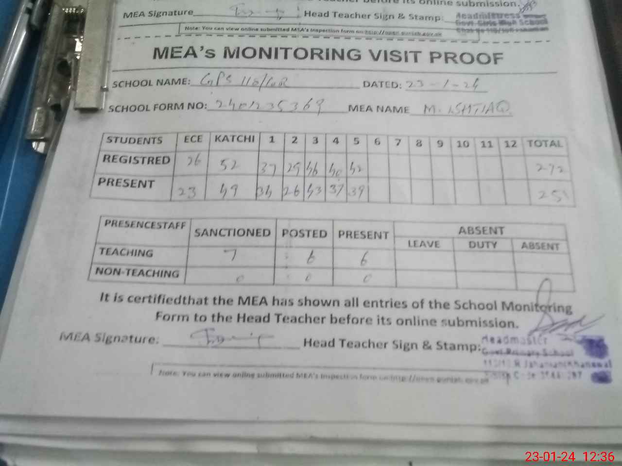 | Attendance Register | Head Teacher | MEA with School | Visit Proof |