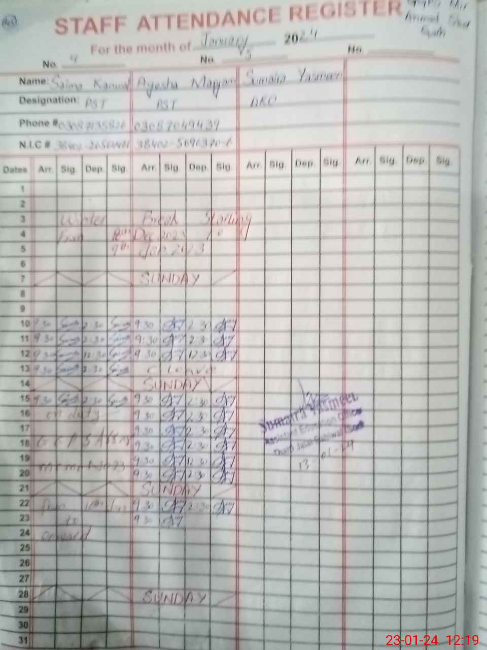 | CNIC | Full Name | Designation | R/C | Absence During Last Calender Month |