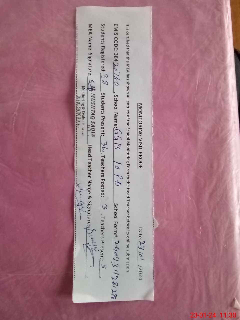 | Attendance Register | Head Teacher | MEA with School | Visit Proof |