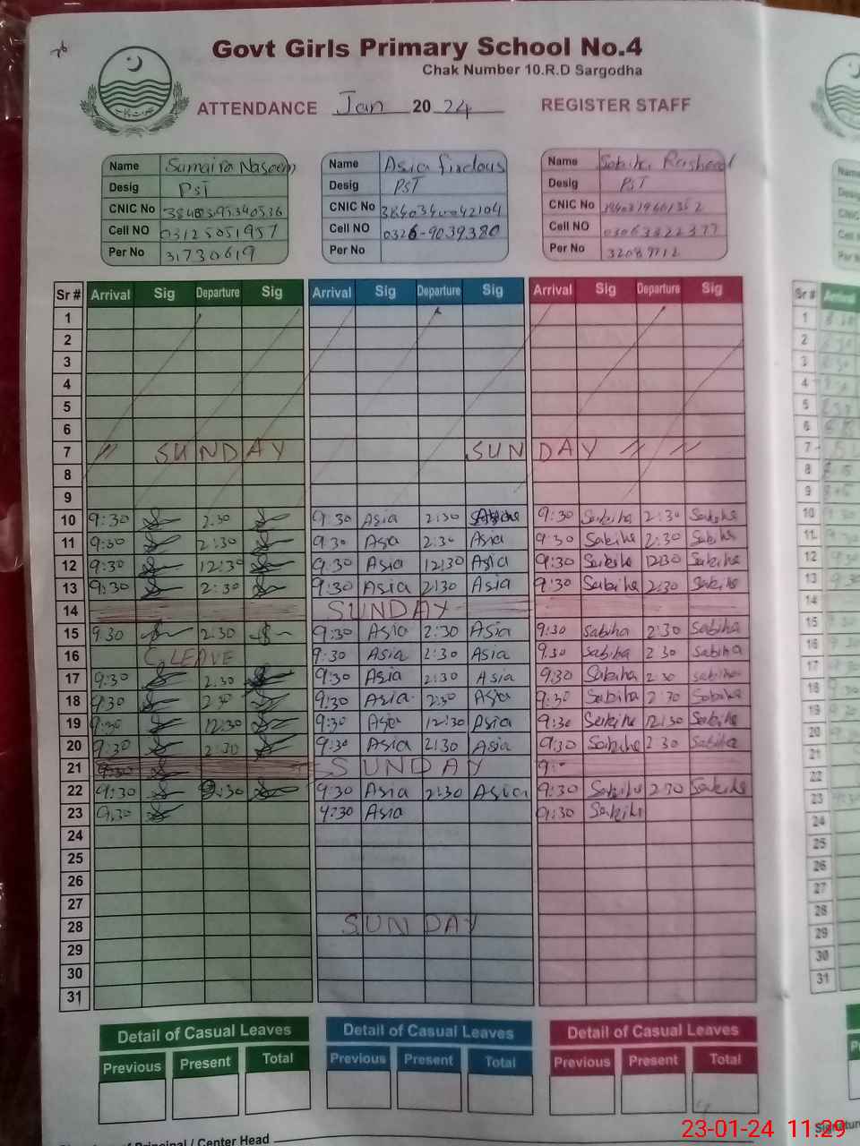 | CNIC | Full Name | Designation | R/C | Absence During Last Calender Month |