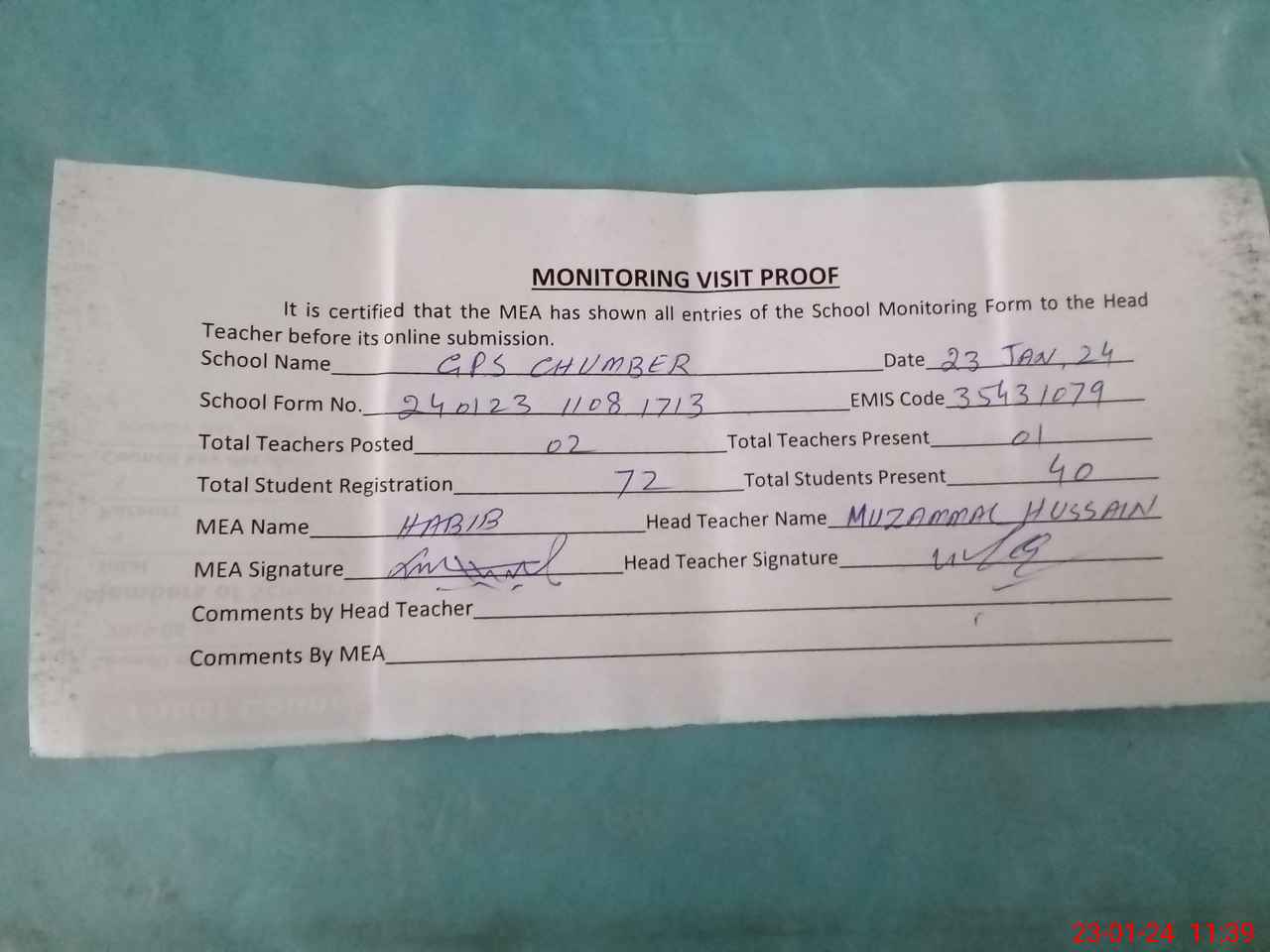 | Attendance Register | Head Teacher | MEA with School | Visit Proof |