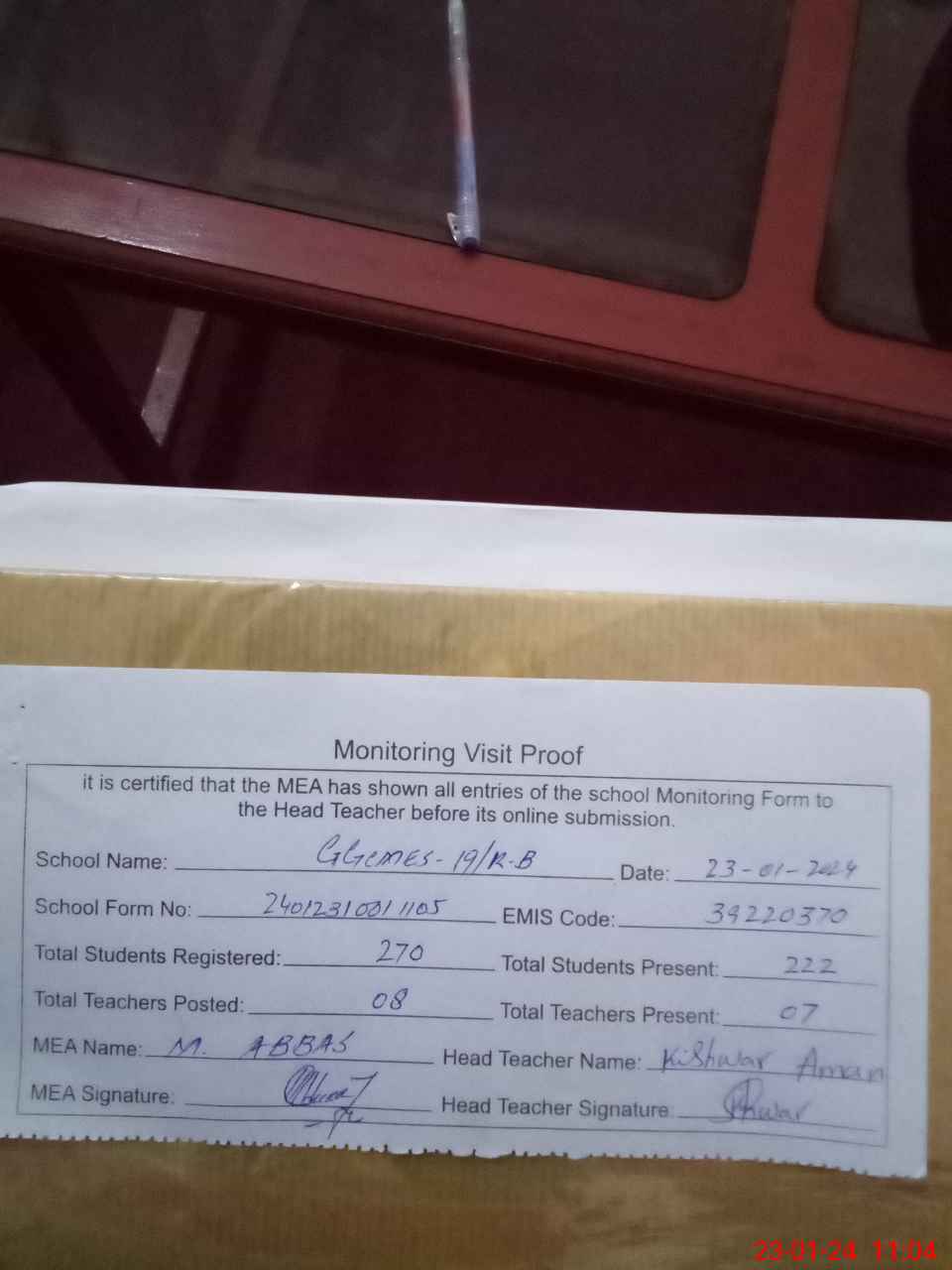 | Attendance Register | Head Teacher | MEA with School | Visit Proof |