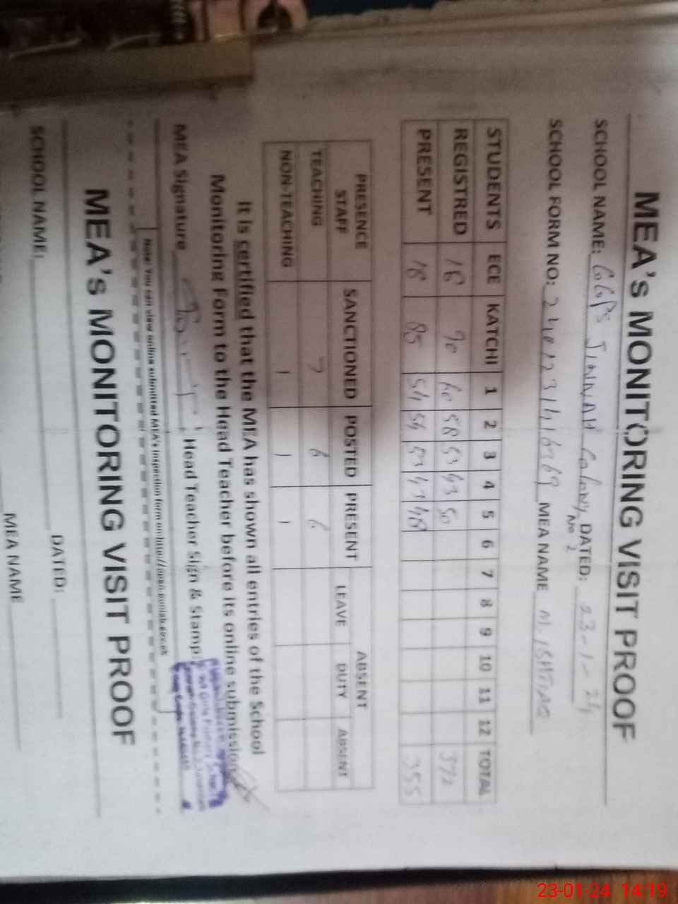 | Attendance Register | Head Teacher | MEA with School | Visit Proof |