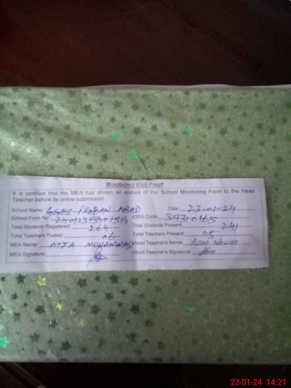 | Attendance Register | Head Teacher | MEA with School | Visit Proof |