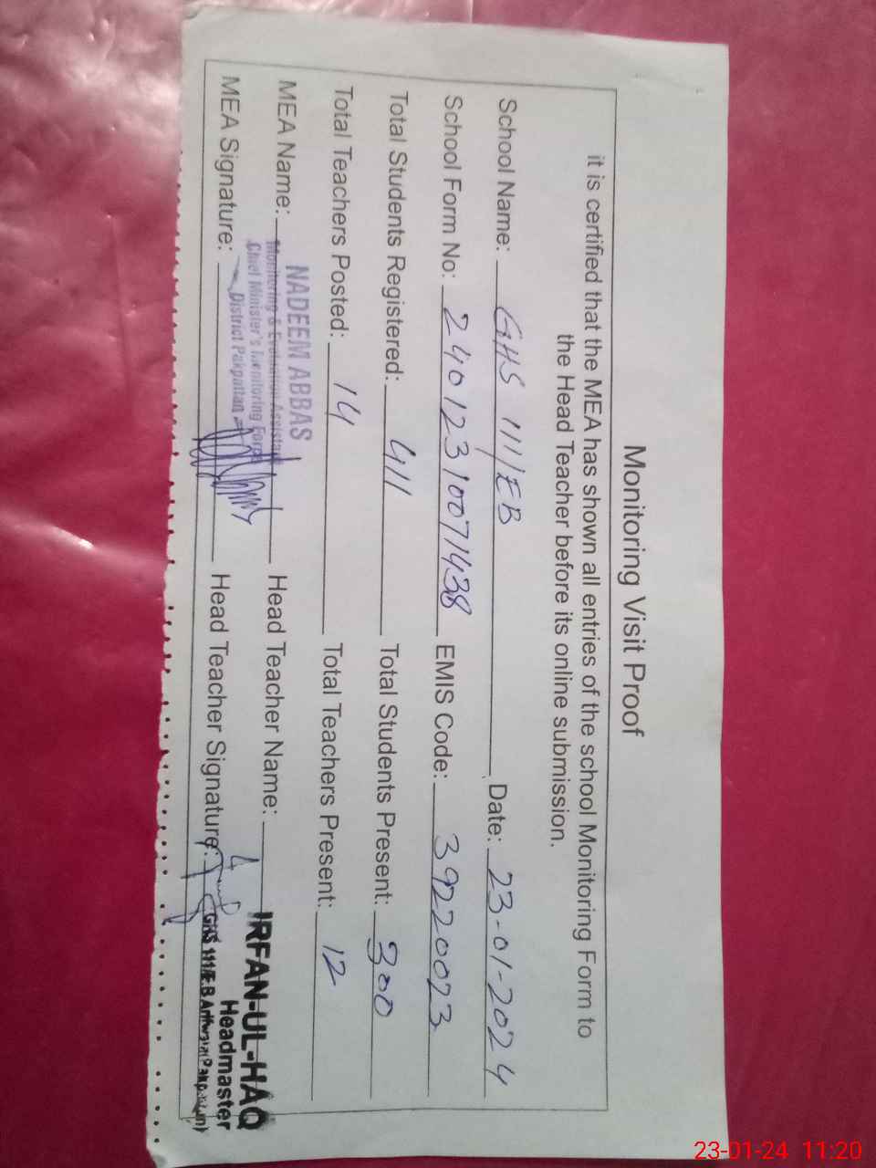 | Attendance Register | Head Teacher | MEA with School | Visit Proof |
